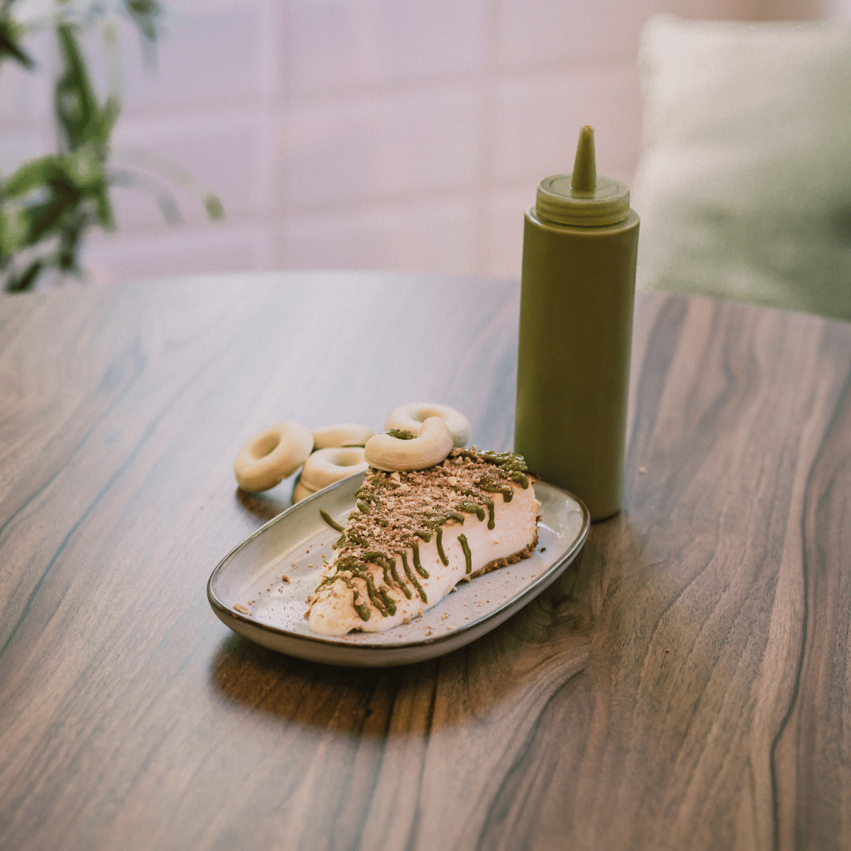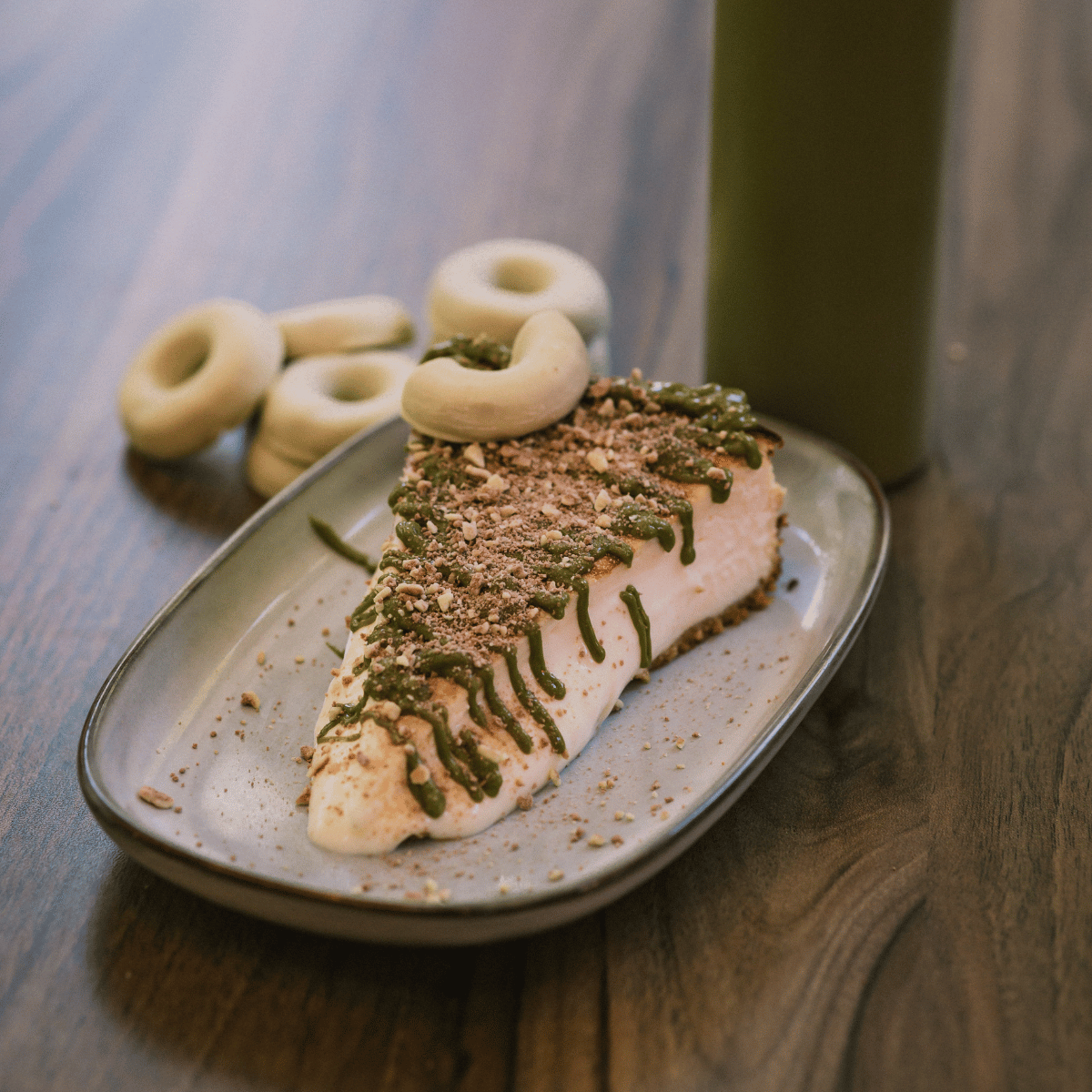 Cheesecake de pistacho y choco blanco con topping de Filipinos. ¡Un vicio elegante!